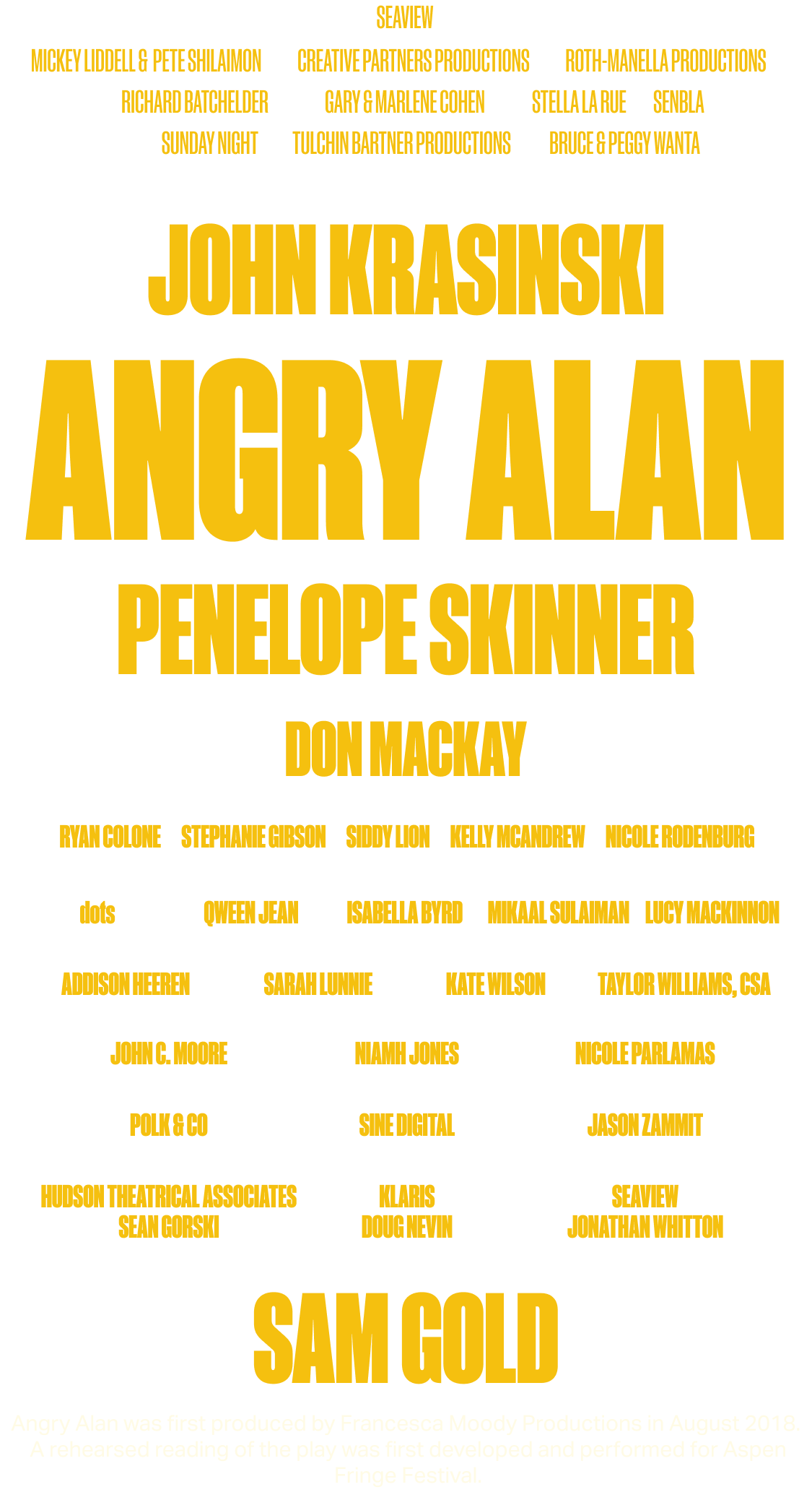 Angry Alan started life in the living room of a corporate housing block in New York in early 2017. (It’s probably worth mentioning that we are married, so particularly well situated to come up with creative ideas late at night, or first thing in the morning over a cup of coffee.) During this particular time, we were in rehearsals for a play at MTC, the political landscape was shifting dramatically, and we had recently watched a documentary called Amargosa. It’s about Marta Becket, a former Broadway and Radio City ballet dancer who buys an abandoned theatre in the Nevada desert, creates her own show, and performs it to an imaginary audience she has painted on the walls. We began talking about creating a piece which could respond urgently to the times we were living in, something we could make ‘happen’, without the need to wait for the slow-moving programming decisions of traditional theatre venues. Like Marta, we had no idea if our idea would or could ever find an audience. But since those early conversations, somehow the story we created has travelled around the world: from Aspen to Delhi, to Edinburgh, London, Canada, in translation in Paris, Brazil, Italy, Germany and Estonia and now – in a brand new incarnation commissioned by Studio Seaview – and with an exciting new creative team – to New York City. In some ways, it’s hard to reflect on the extraordinary journey of this play, because Roger’s story feels – if anything – more urgent in 2025. And that thought cannot exist without some sadness. But we are so very grateful to the team behind this production: for the sheer talent, enthusiasm and brilliance of John Krasinski and Sam Gold; and the passion and support of Greg Nobile and everyone at Studio Seaview. We have been galvanised and encouraged to rework the piece, to transform and update it for the present, to bring Roger to a new audience (real, not painted), back in the city where this play was first conceived.